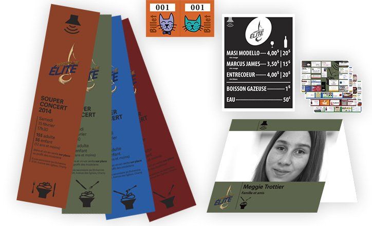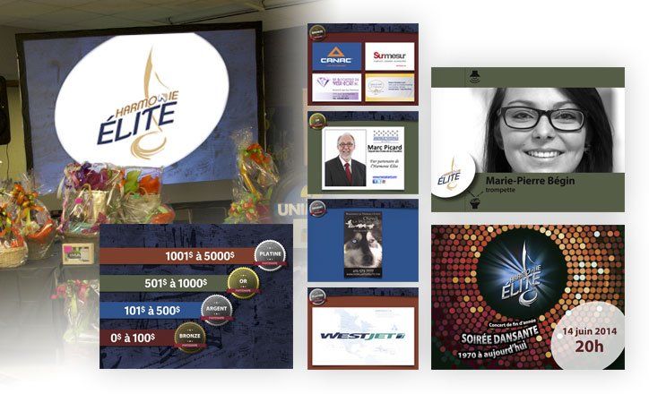 Logo, dépliants, site web, présentation "Power Point", flyers, billets spectacle, cartons d'invitation, affiches, napperons, portfolio.